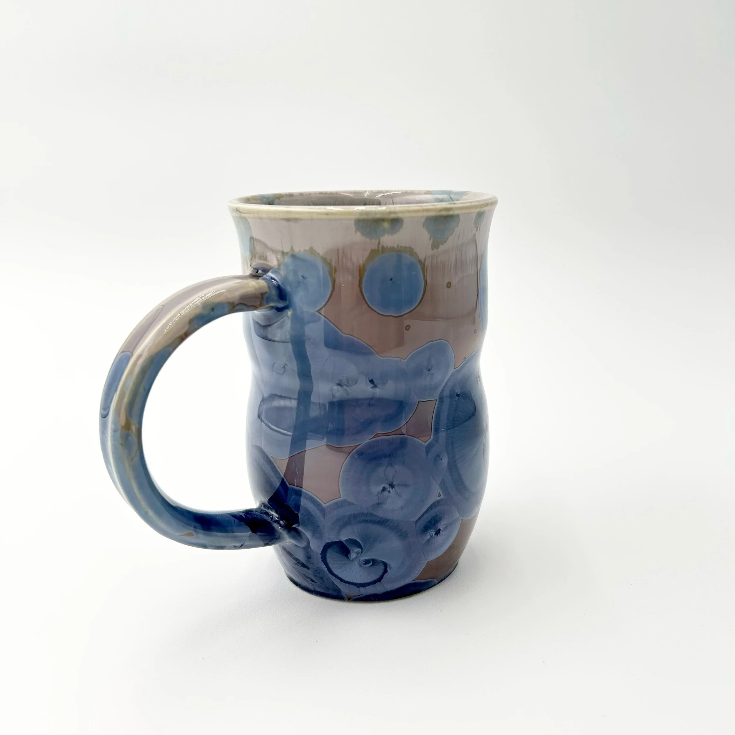 Wheel thrown porcelain mug with crystalline glaze. Light purple to beige variegated background with stunning circular purple crystals.